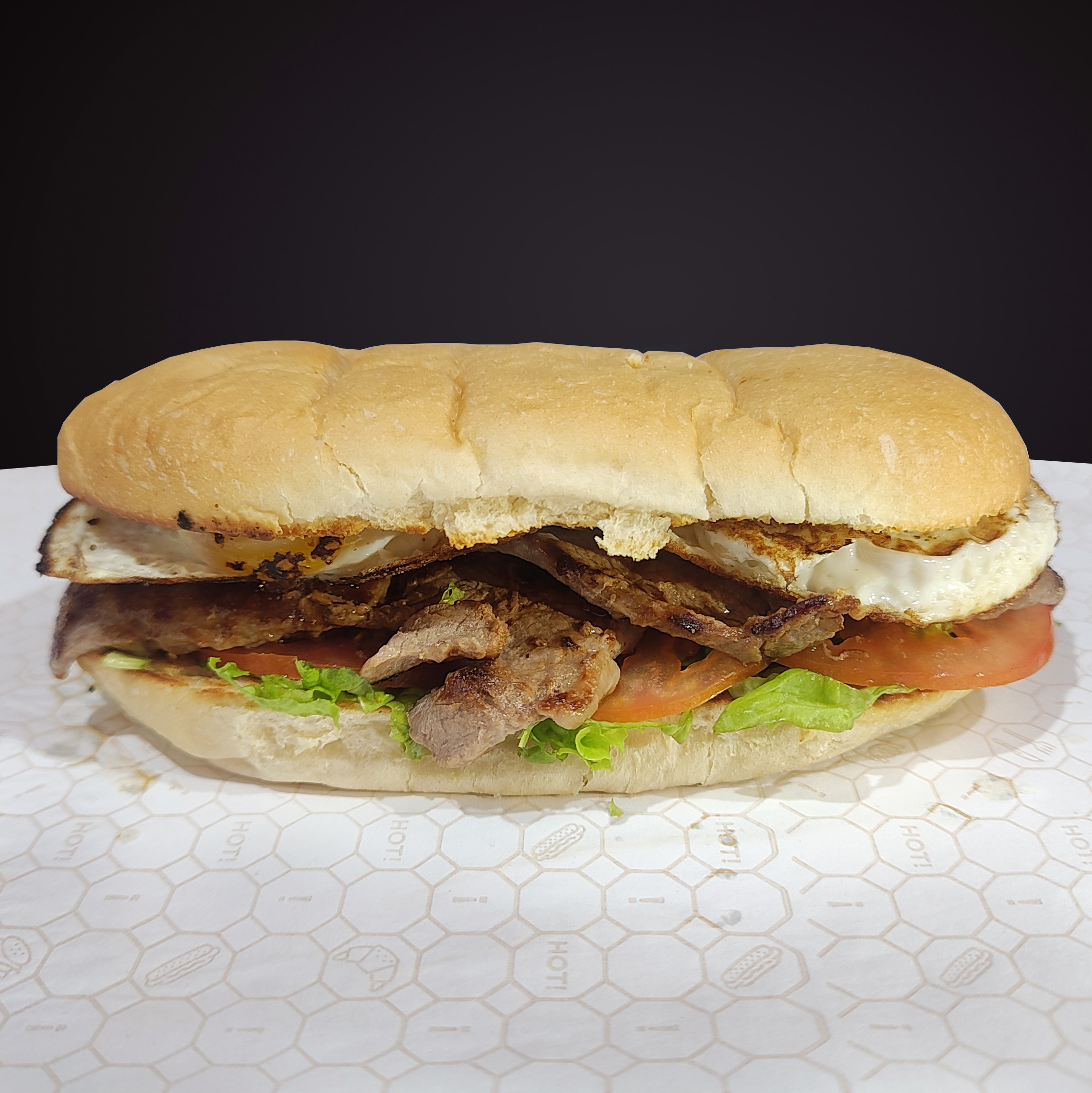 Elaborado con bola de lomo, Huevos, Tomates, Lechuga y aderezo en pan artesanal. acompañado de una porción de papas fritas.