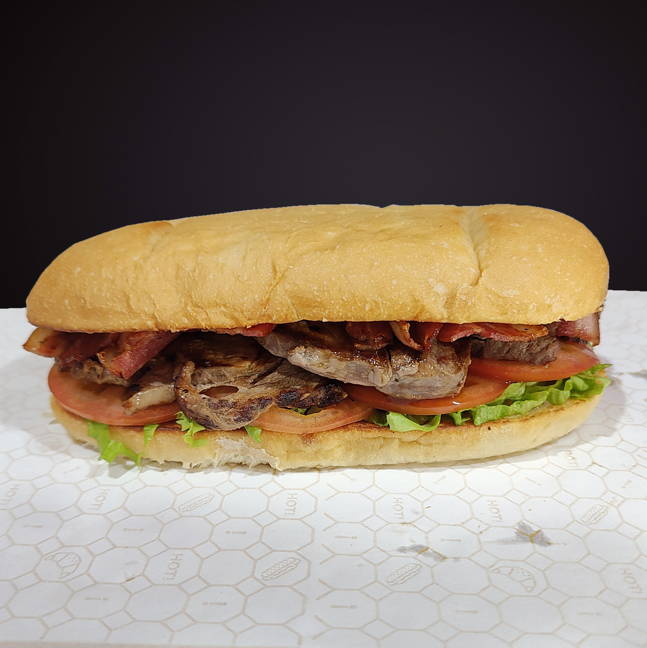 Elaborado con bola de lomo, Panceta ahumada, Tomates, Lechuga y aderezo en pan artesanal. acompañado de una porción de papas fritas.