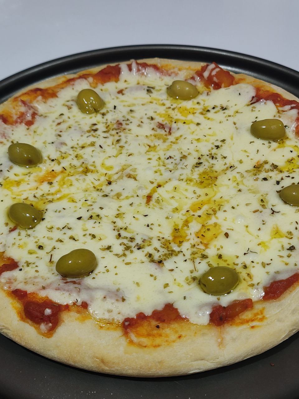 Salsa de tomate, Queso mozzarella, Aceitunas, Oregano, Pizca de aceite de oliva con ajo.