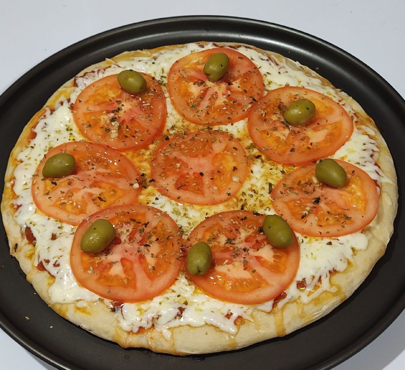 Salsa de tomate, Queso mozzarella, Aceitunas, Tomate en rodajas, Oregano y pizca de aceite de oliva con ajo.